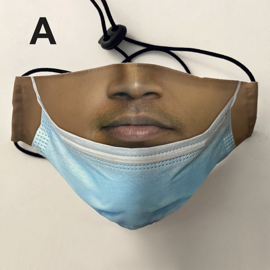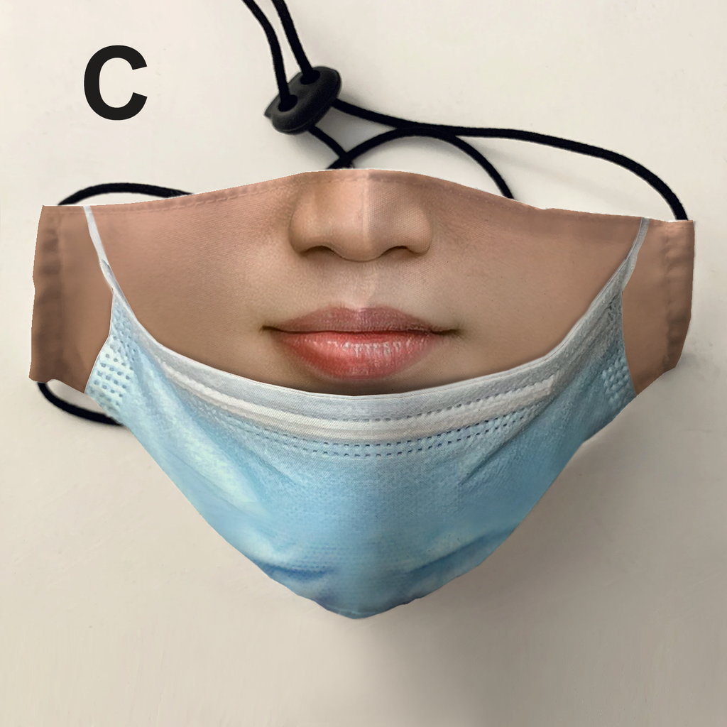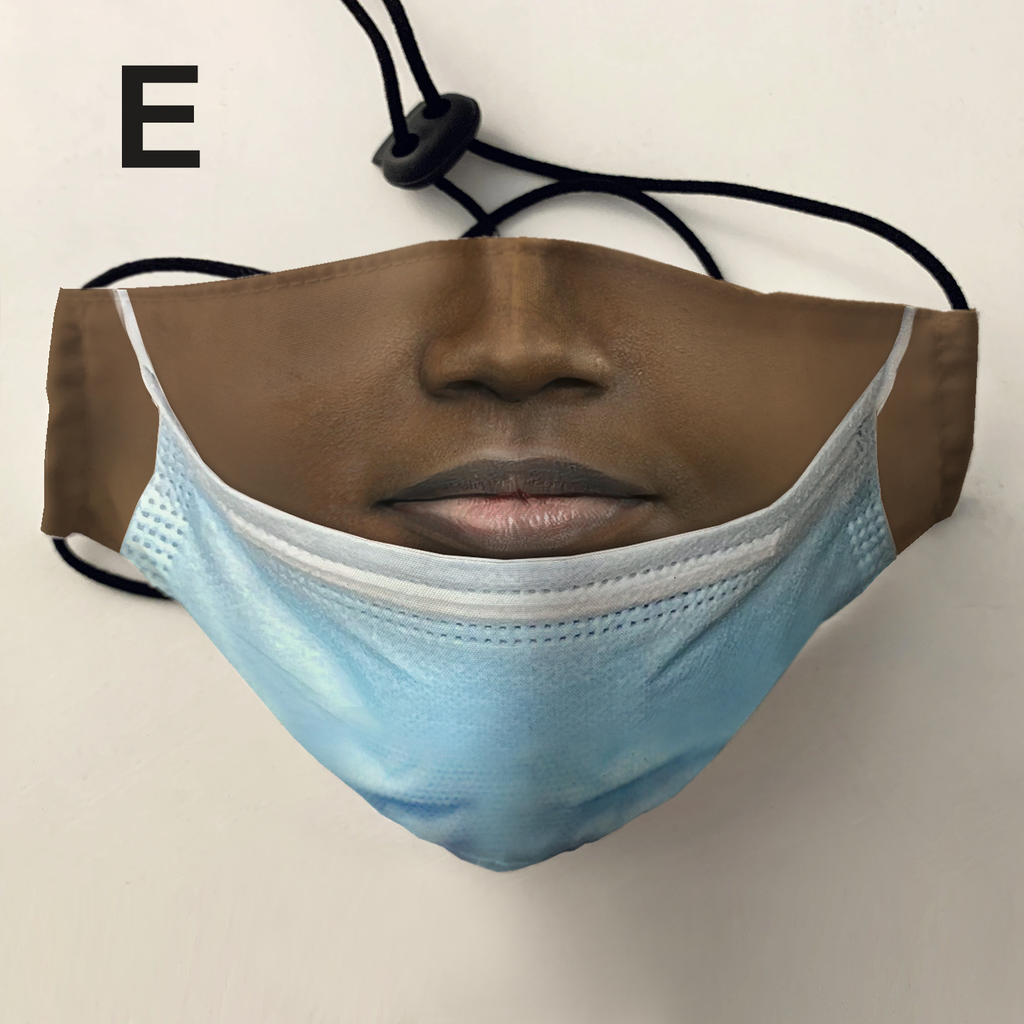 Maybe you've seen a mask like this on TikTok. We made this optical-illusion mask available in a variety of skin tones and features, printed and sewn on a protective 2-layer mask with high thread-count fabrics.